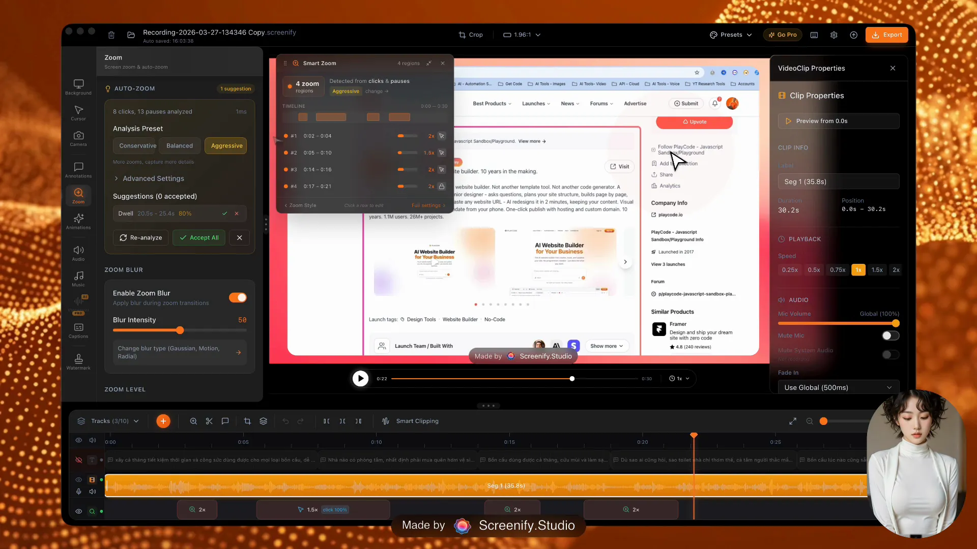AI detects clicks, typing & mouse dwell to auto-zoom. 24 callout bubble styles.