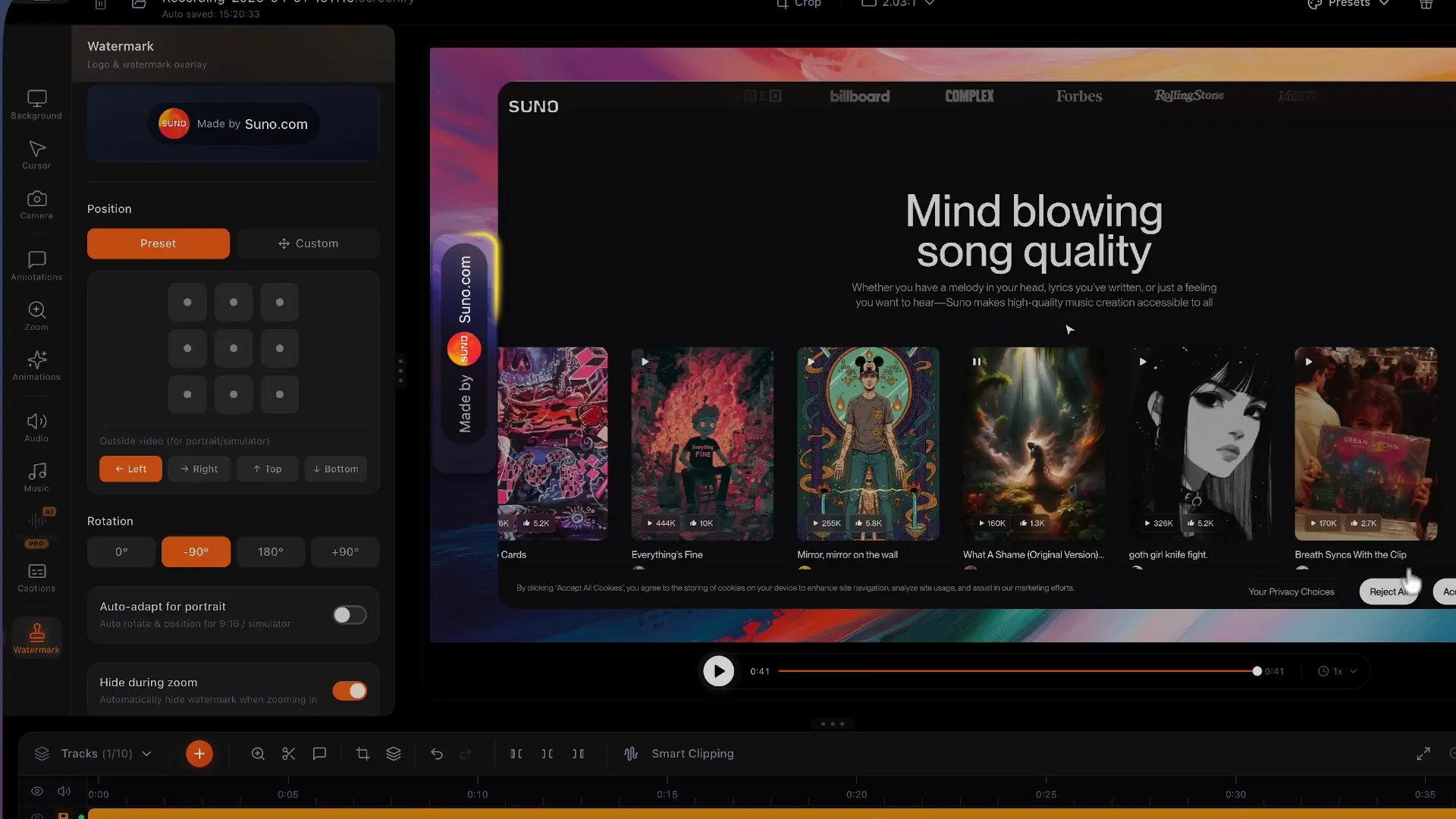 AudioBuilt-in royalty-free music and sound effects. Adjust volume, fade in/out per clip.